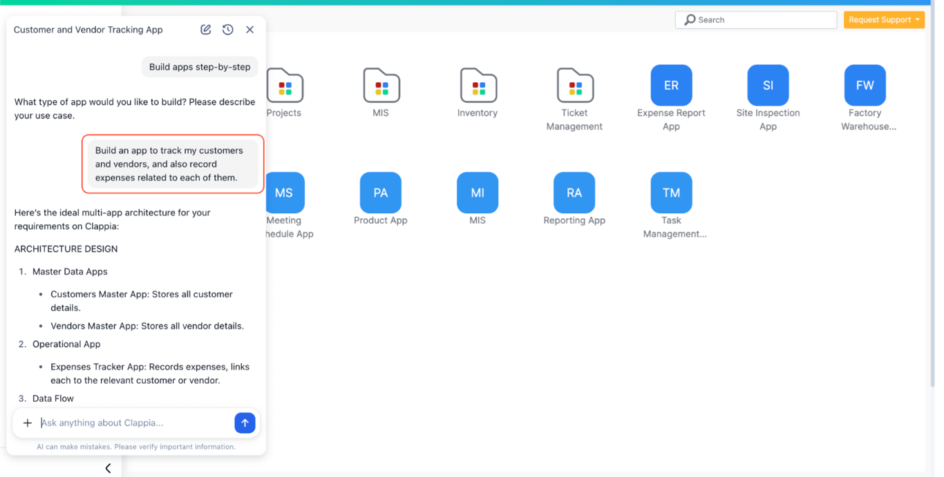 The AI Assistant in Clappia can now generate entire apps, not just suggest structures or logic. It first creates a proposed app structure based on your use case and shows it to you for approval. You can ask for changes, refine the layout or logic, and then proceed with the final structure. Once the app is created, you can open it, verify everything, and continue using the AI Assistant at any time if more adjustments are needed.