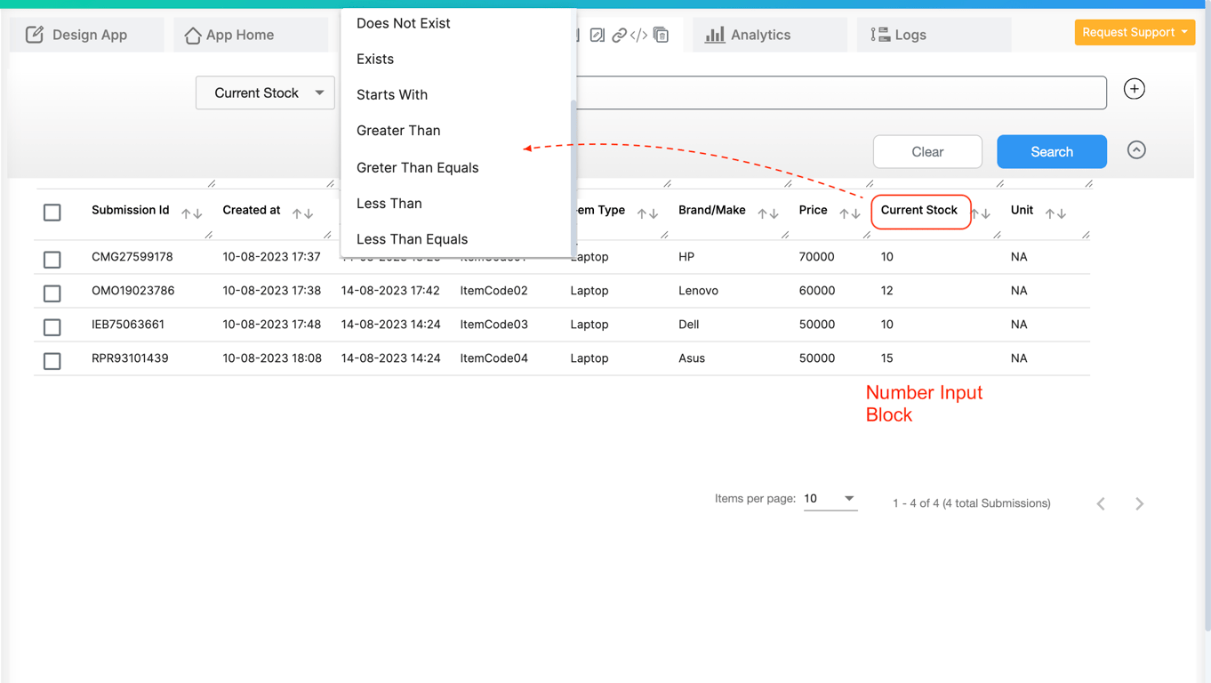 You can now filter submissions using Number Input fields with conditions like greater than, less than, equal to, and more. This helps you quickly narrow down records based on numeric values such as quantity, amount, weight, or score.