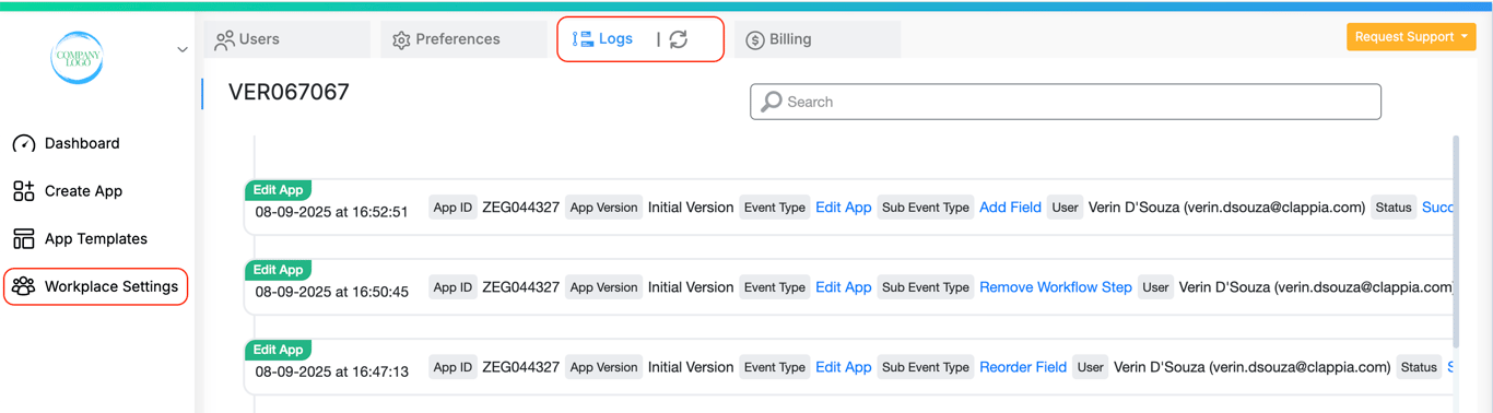 A new Workplace Logs section is available under Workplace Settings. Just like App Logs and Workflow Logs, it shows all workplace-level activities, including changes made across any apps in the workplace.