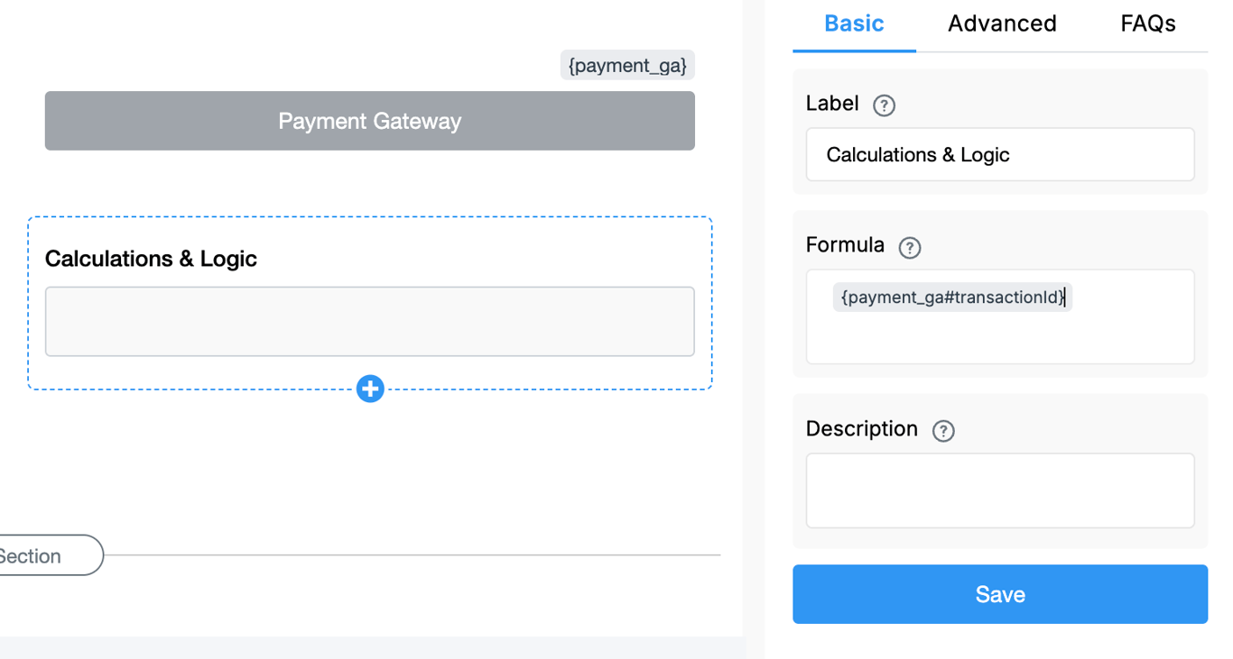 The Payment Gateway block now captures transaction ID. Once the payment configuration is saved, you can use a Calculations & Logic block to store the transaction ID whenever a payment is successful.