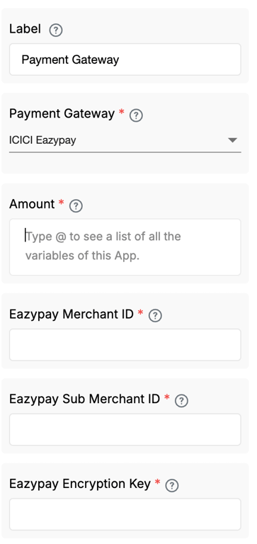 ICICI EasyPay is now supported as a payment gateway. Once admins create an EasyPay account, the provided credentials can be used to configure the payment gateway in Clappia apps.
