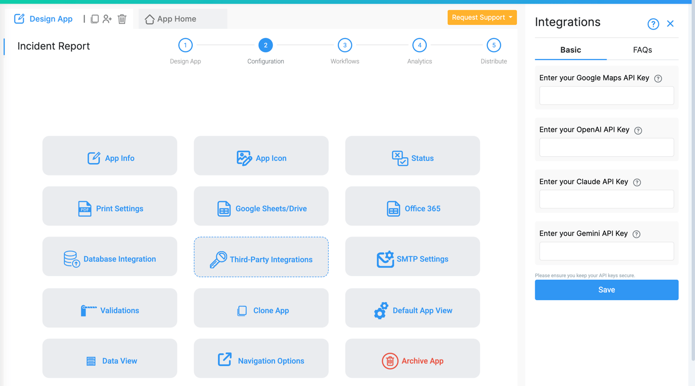 You can now add your own OpenAI, Claude, or Gemini API keys for AI Blocks and AI Workflow Nodes. This is available at the app level under Third-Party Integrations. When you use your own key, your app is not restricted by the default workplace AI usage limits.