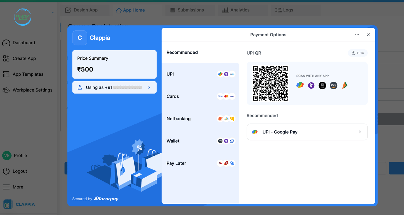 Clappia now supports secure transactions with the new Payment Gateway block, allowing you to collect payments from your users directly through the app. In addition to handling payments, you can also set up email confirmations or notifications to be automatically sent upon successful transactions, ensuring both you and your users are informed in real time. Easily manage transactions within your Clappia app.