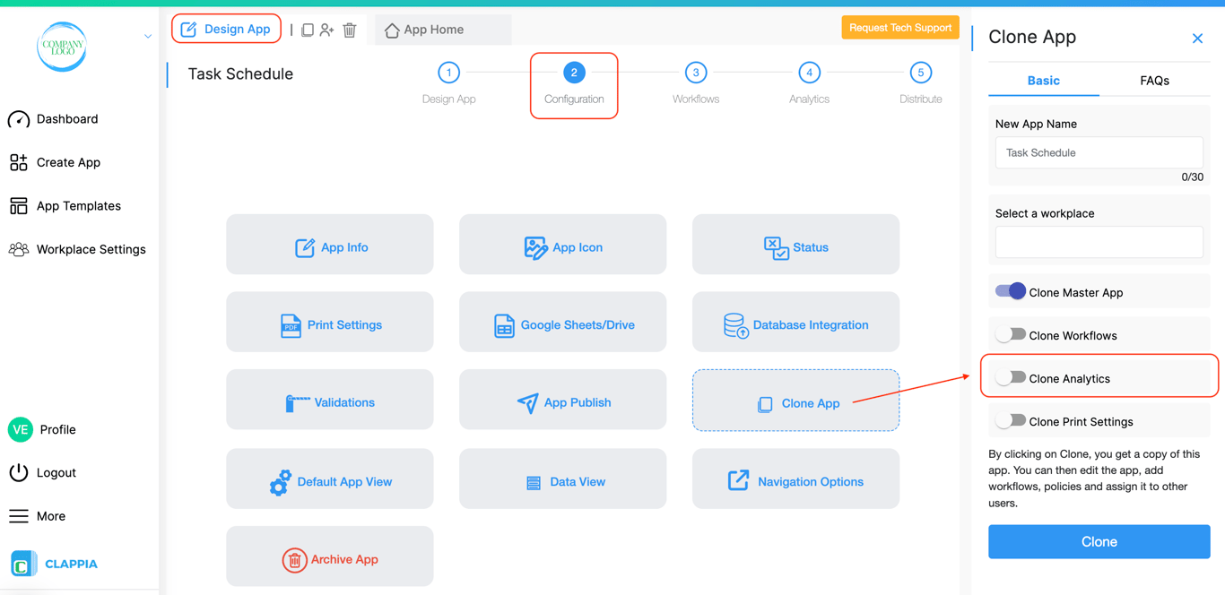 You can now choose to clone analytics in addition to workflows, PDFs, and master apps. When cloning an app to another workplace, simply select the configurations you want to include, ensuring that all key components of your app, including analytics, are carried over to the new app.