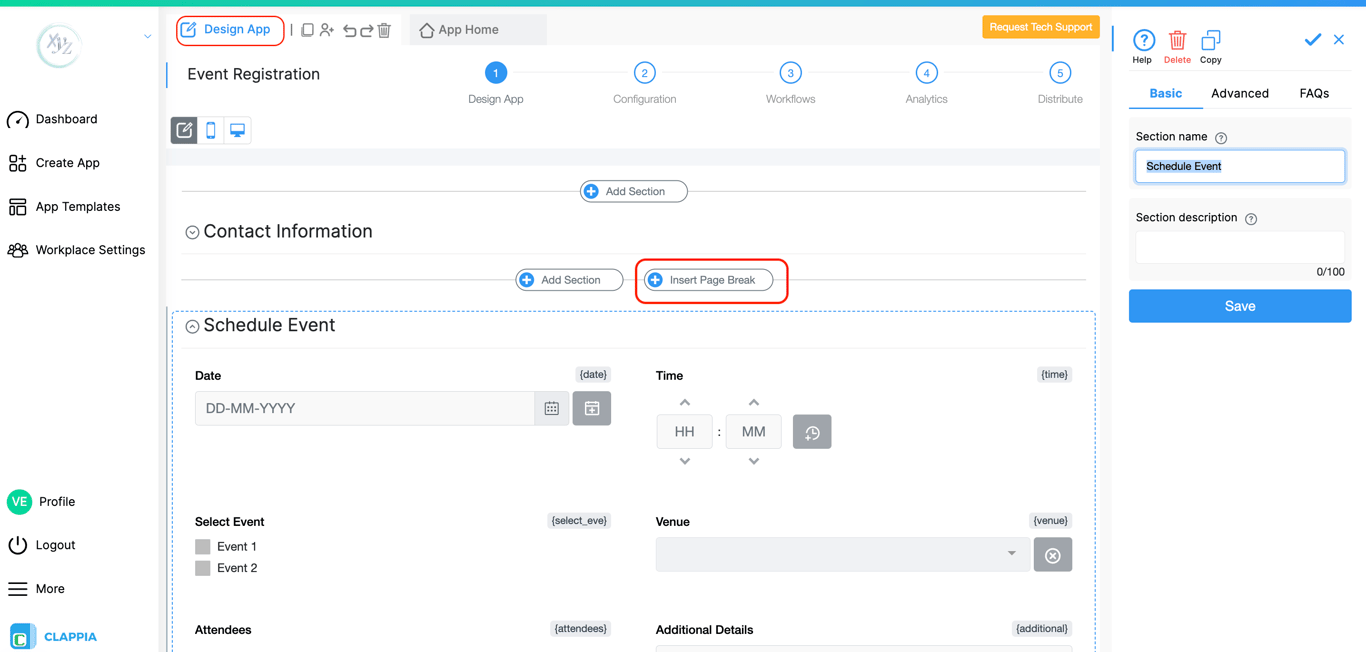 Improve navigation and organization in your apps by dividing them into multiple pages. This feature allows each page to host various sections and fields, simplifying longer apps. To create a page break, simply select the 'Insert Page Break' option under the Design App tab, positioned before any section.