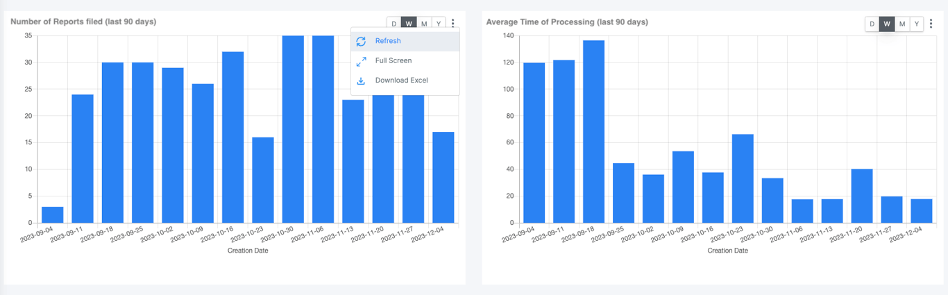 Embedded charts now support Date/Month/Week attributes. Additionally, it also includes the Refresh, Download Excel and Full Screen options.