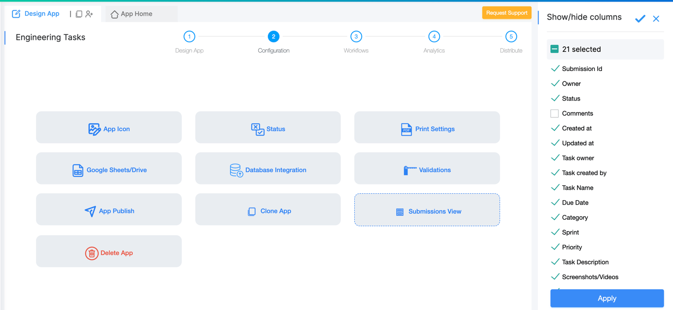 The default submissions table view contains all the fields of the App in addition to the standard columns like Submission ID, Creation Date, Owners etc. All these columns might not be relevant for the end users. So the App Admins can mark these columns as hidden in the App Configuration and when the end users open the submissions table, these columns will be hidden by default. The end users can also override these settings.
