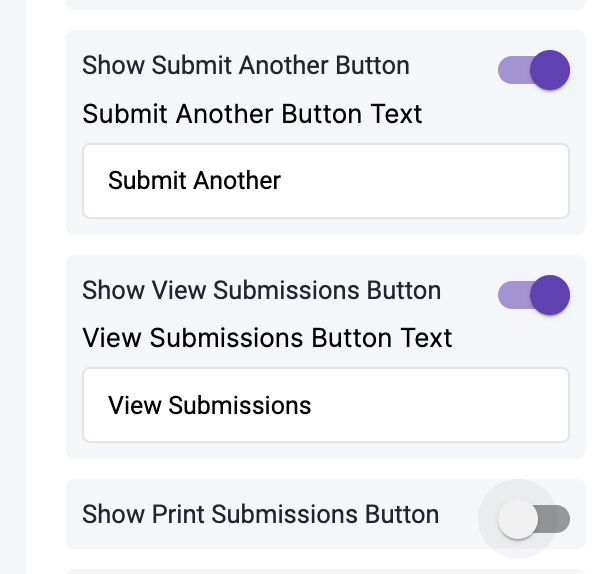 New configuration options have been added in the Submit Button Settings. App Admins can now rename the following buttons - Submit, Save Draft, Discard Draft, Submit Another, View Submissions and Print Submission. These buttons can also be configured to stay hidden.