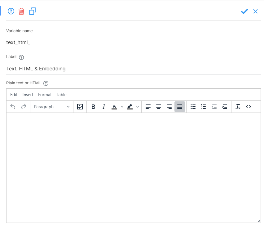 Introducing an all-new editor in the Text, HTML & Embedding block with numerous formatting options to create compelling content in the form of read-only instruction, help text, formatted text, images, and videos. Learn more.